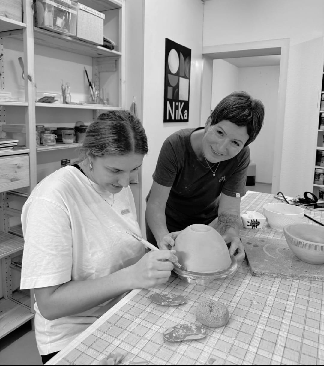 Mit meiner Werkstatt-Partnerin und lieben Freundin Kathrin habe ich das ideale Gegenüber gefunden. Wir ergänzen uns grossartig und sind im Handwerk mit Ton, Glasuren und Brenntechniken inzwischen sehr erfahren. Unseren Ideen für neue Werke sind keine Grenzen gesetzt. Angefangen bei mir zu Hause in einem kleineren Atelier geht für mich mit der NiKa Mal- und Töpferwerkstatt ein Traum in Erfüllung.